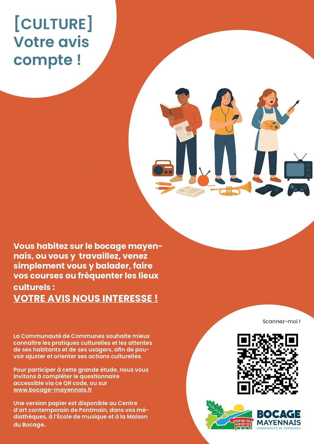 - Le pôle culturel de la Communauté de Communes du Bocage Mayennais lance une étude auprès de ses habitants et de ses usagers afin de mieux connaitre leurs habitudes et leurs attentes culturelles, ainsi que les freins qui peuvent exister sur le territoire.