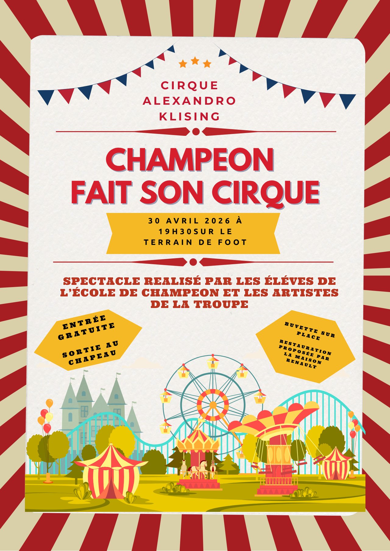 Le 30 avril 2026 à 19h30, le terrain de foot se transforme en piste aux étoiles pour accueillir “Champéon fait son cirque”.